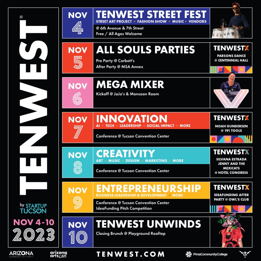 TENWEST is an annual week-long festival celebrating the growing innovation, creative, and entrepreneurial ecosystems in Southern AZ. Unique in its cross-industry approach, TENWEST showcases the connectivity between technology, entrepreneurship, creativity, culture, and impact, uniting attendees to gain the knowledge and inspiration they need to innovate within their own careers and communities.